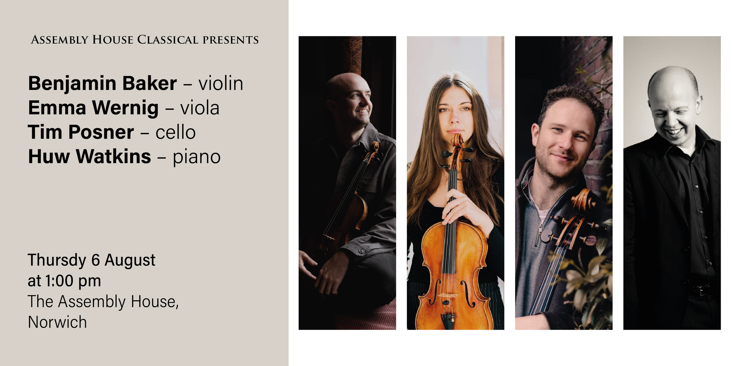 The Assembly House Classical Lunchtime Series welcomes an outstanding ensemble of international musicians for a special afternoon of chamber music. Violinist Benjamin Baker—praised by The New York Times for his “virtuosity, refinement and youthful exuberance”—is joined by rising-star violist Emma Wernig, award-winning cellist Tim Posnerand renowned Welsh composer-pianist Huw Watkins.