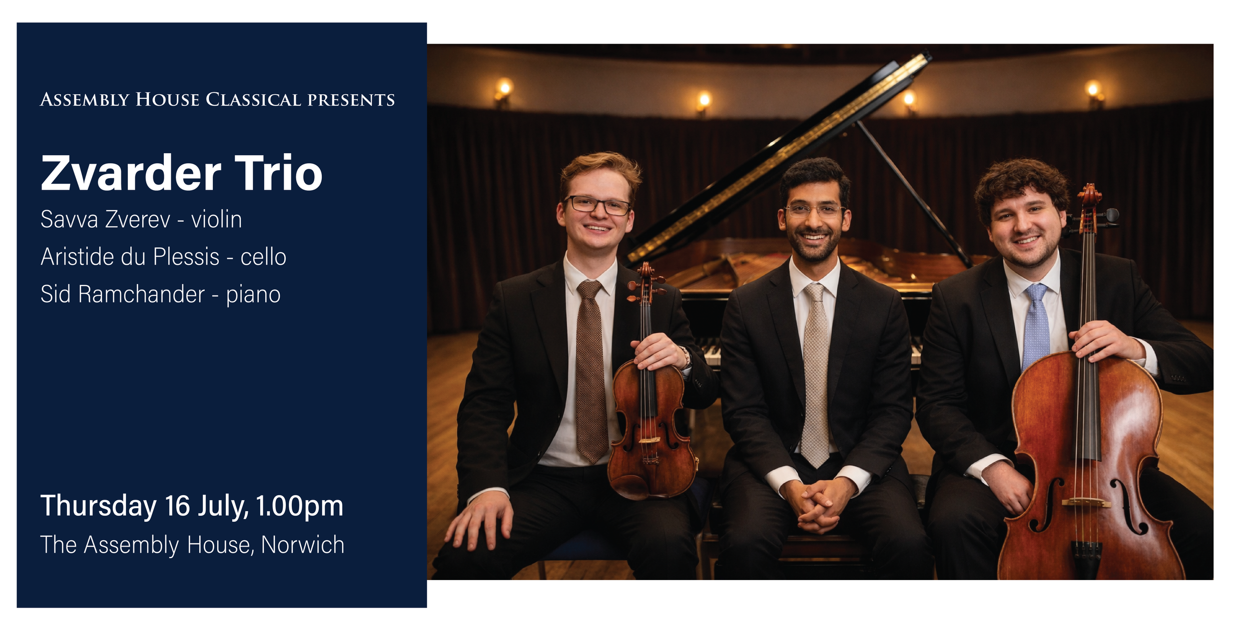 Zvarder Trio is a dynamic piano trio featuring violinist Savva Zverev, cellist Aristide du Plessis, and pianist Sid Ramchander. Comprising accomplished musicians with prominent orchestral and chamber experience, the ensemble delivers passionate interpretations of core Romantic and Classical repertoire, including major works by Mendelssohn, Tchaikovsky, and Brahms in recent performances.